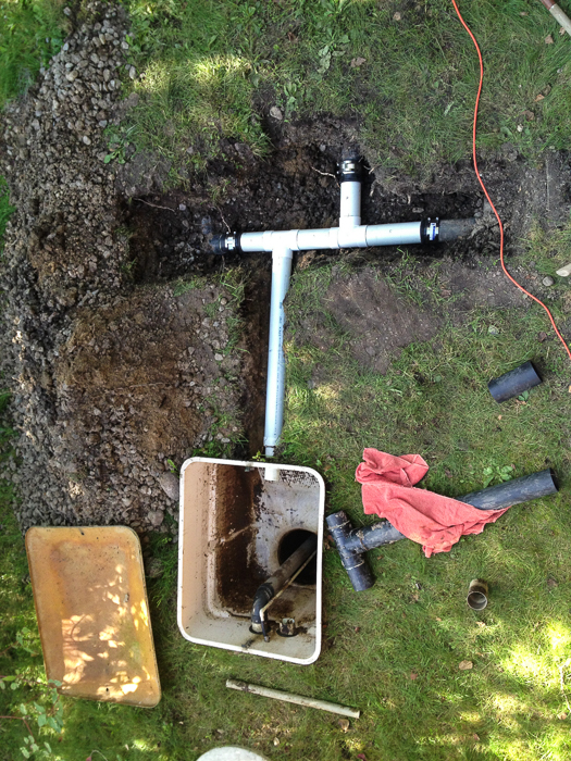 The fluid from the rectangular settling tank is not flowing out into the field. This pretty much puts the cottage on high alert as everything that flows into the tank is about to start spilling out all over the yard.