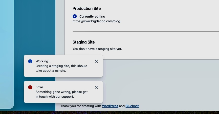 The upgrade was not without a few bumps along the way. First up is a backup of everything, I’ve been burned before so now I’m a big backup believer. Also, my hosting service, BlueHost, offers a tool to create a staging site and also push the staging site back up to production. This seems like a good idea and it is also the 1st problem. I click the button to create the staging site and it gets an error 😕.