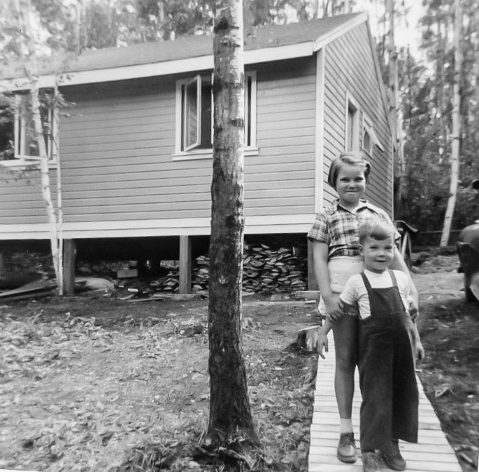 Here we are, my sister Gail and myself in front of the cottage, next to the driveway, which is on moderate slope. This will become important later. I think Gail is restraining me here so that I’d hold still for the picture as my arms seem to be pinned behind me.